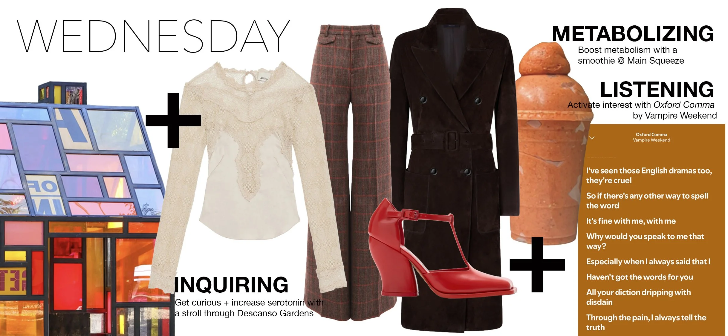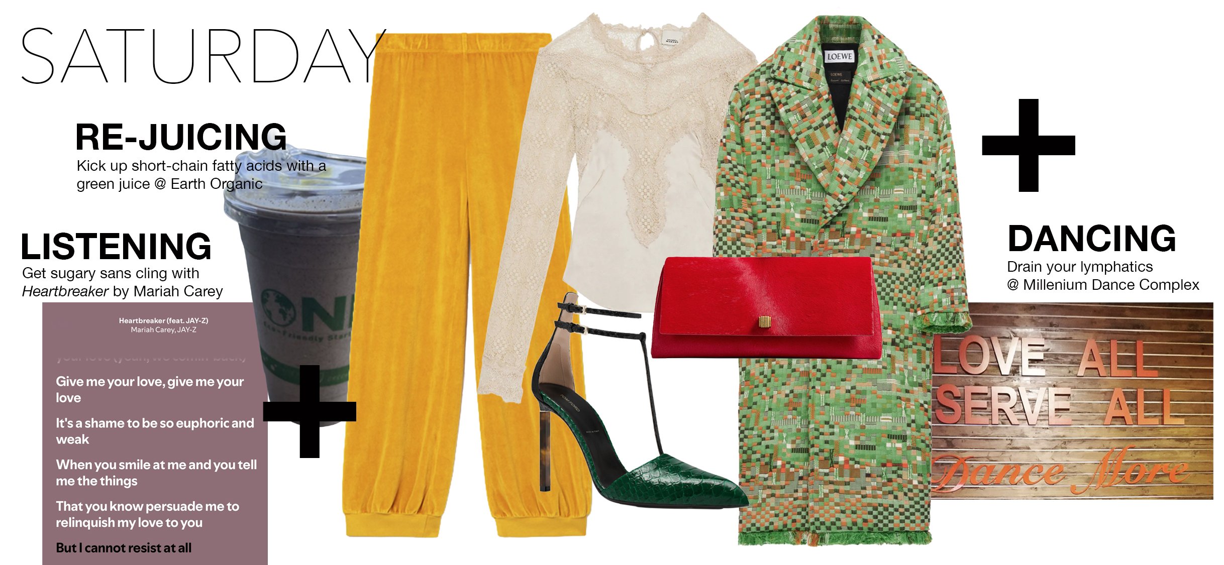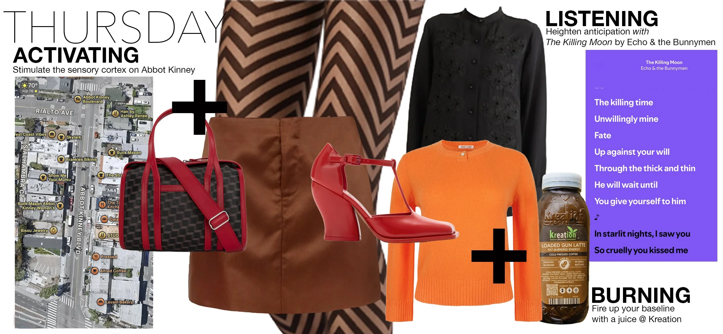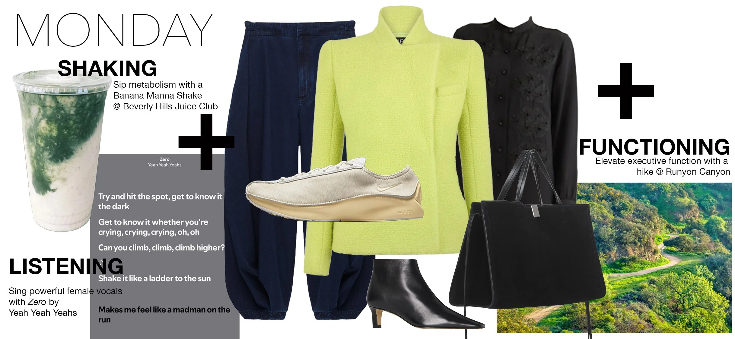 Monday hit play on Zero by the Yeah Yeah Yeahs. The rebellious vibe pulls Kapha outward to break up stagnation. That means, increased behavioral activation (increase motivation to initiate action, AKA get up and start doing something), faster cognitive tempo (faster response or mental energy), dopaminergic activation (more drive, energy, and engagement). Tom Ford’s neon blazer in a sharp and asymmetrical structure cancels the most depressing day of the week.