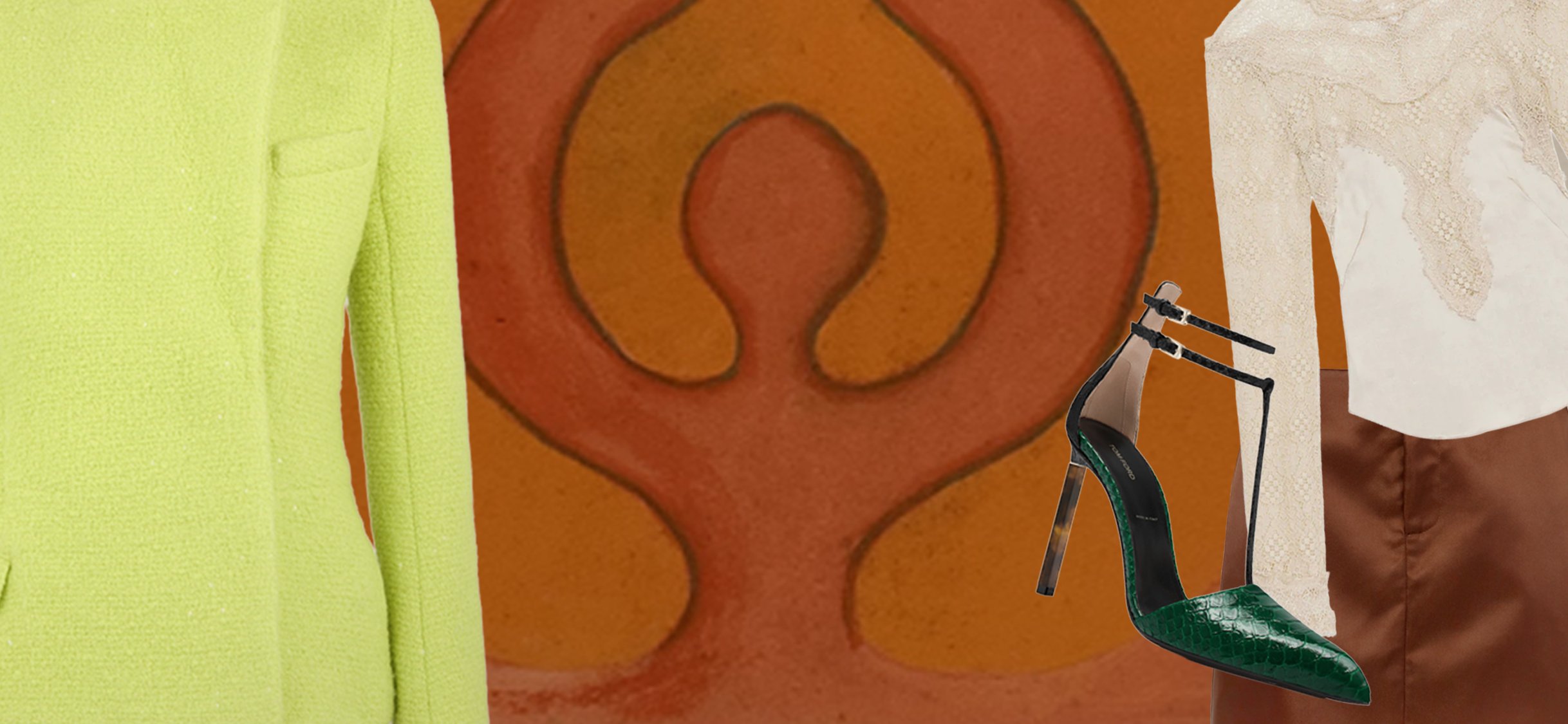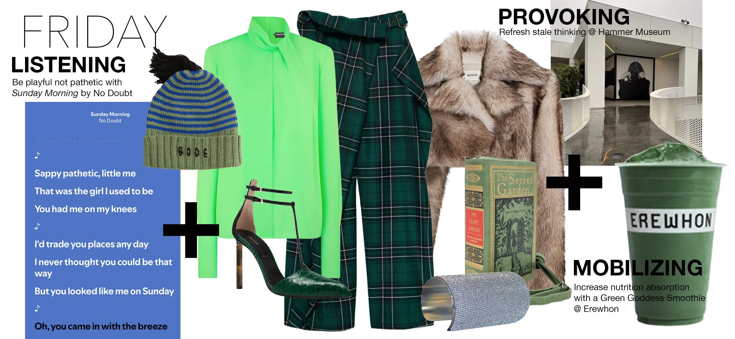 Wrap up this 5-day fest by returning Green-Eyed Monster psyche, and investing in Green Goddess magnetism. Pairing sultry stilettos a la Tom Ford by HA with wooly plaid, silky neon, and fuzzy fur keeps the doorway to the weekend chic and on-point. Quirky additions like one-off accessories from Patricia Field and Bode are most stimulating here because oh, what fun, here’s novelty again!