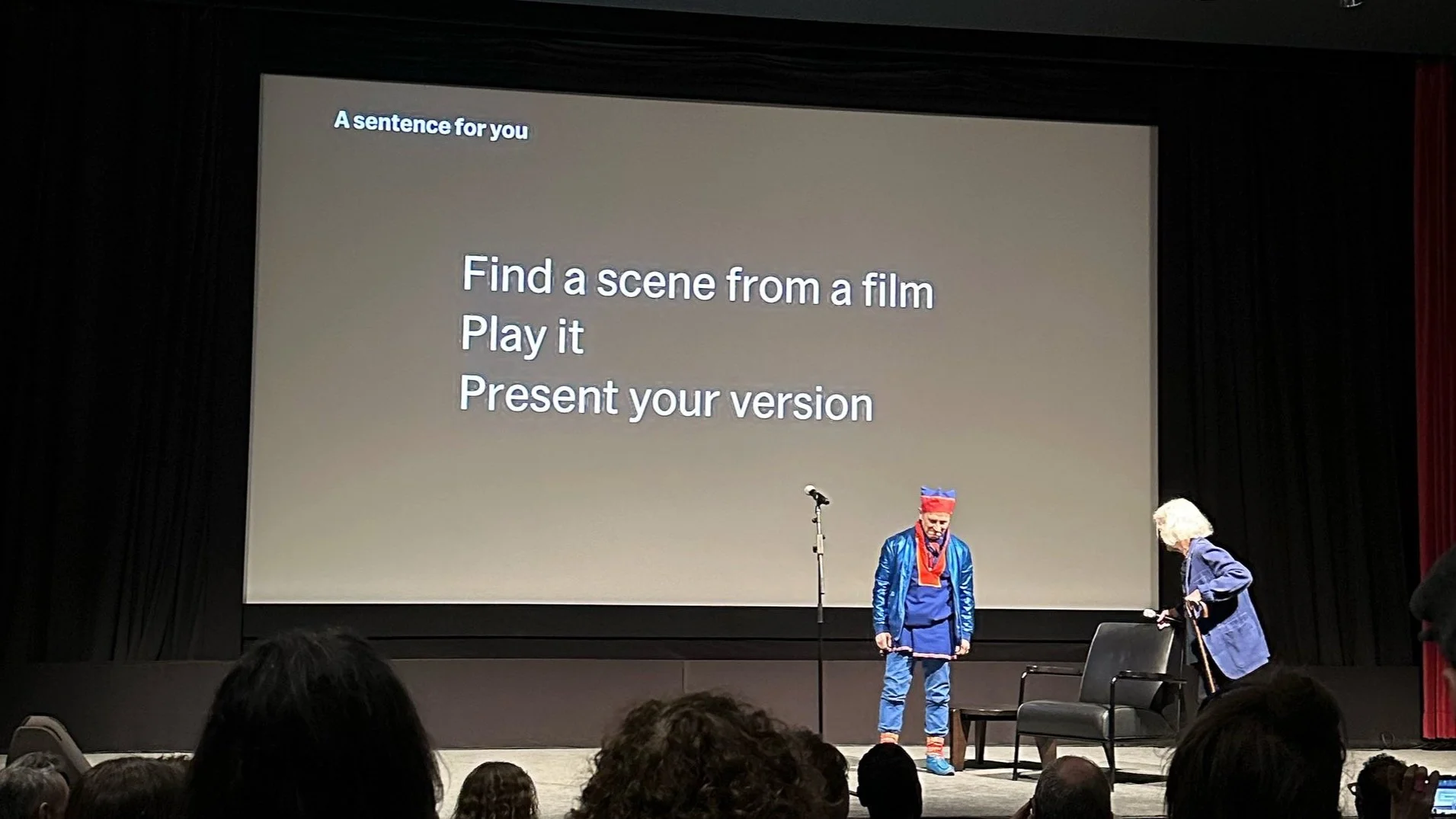 Scientist David Gruber was a no-show. His work on the sounds of sperm whales served to inspire Jonas’ Moving Off the Land. In place was a friend of Joan’s from Scandinavia. Wearing a blue and red crown, his sentence was “find a scene from a movie, play it, present your version”. This artist reminded us to accept other cultures. Not just ones that we think we need to accept.