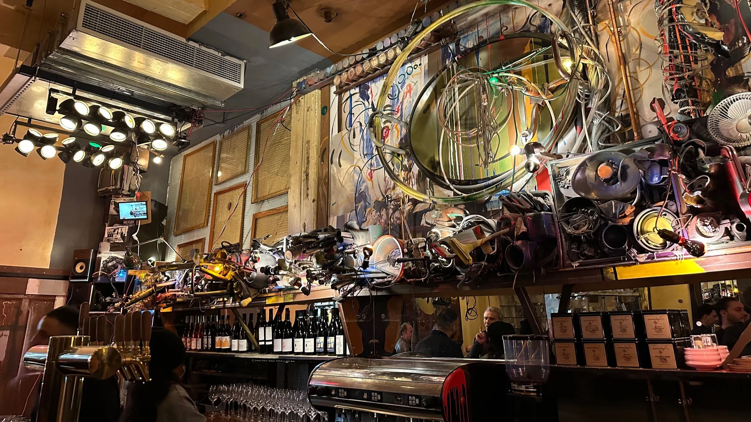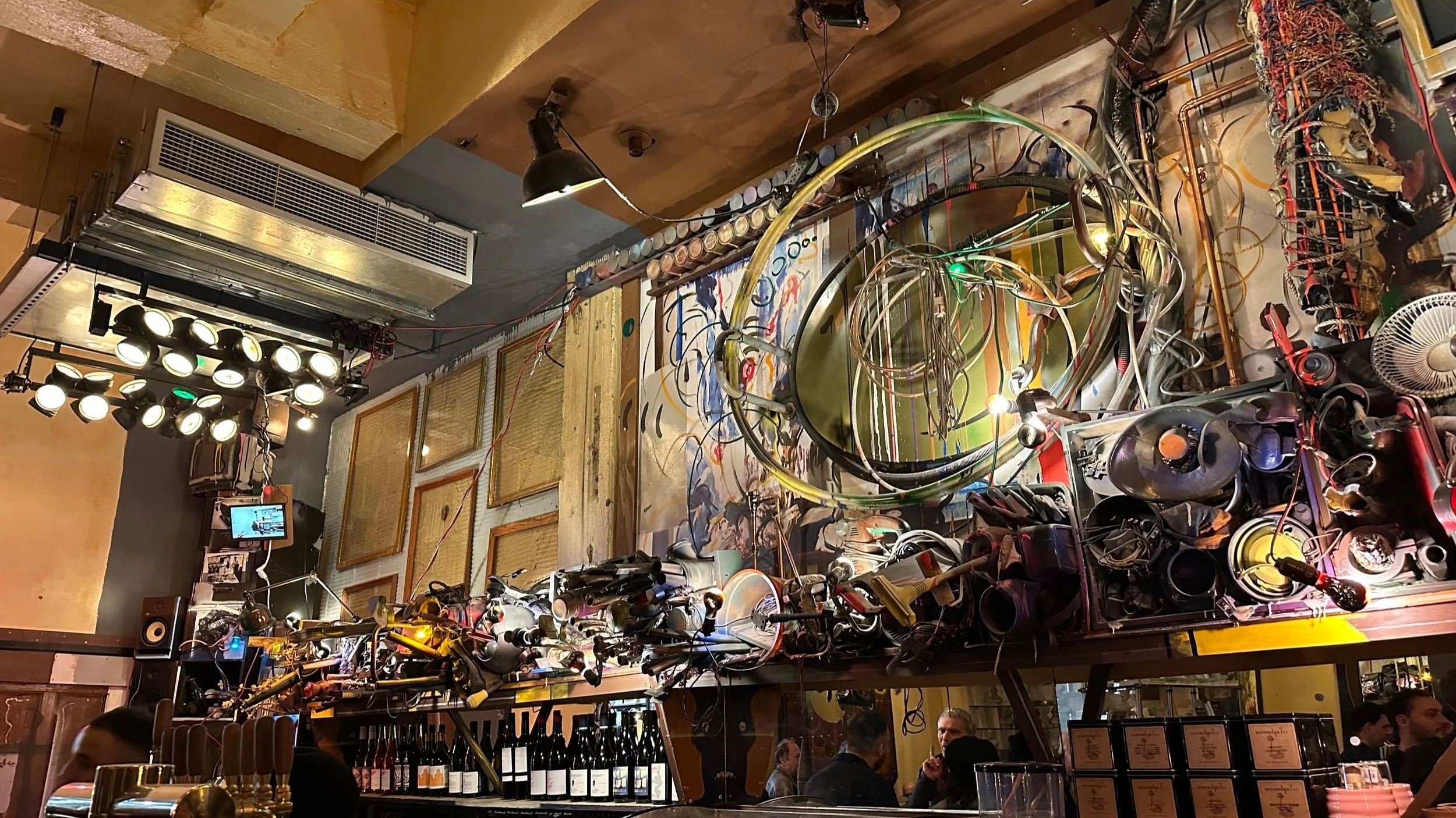 The installation is visually interesting with constant provocation that makes standing at the bar for at least an hour comfortable. Never awkward aside from worrying if the wine glass is going to tip over the sloping counter. A constant stream of videos showing how the bar was built keeps the visual media casualties entertained. The eye travels along all the things that are put together that do not belong together. Monitors, sugar dogs and squeegees unite! It is not clear why rotating disco lights were among Roth’s belongings. This may have been his grandson’s possession as he contributed to creating this bar installation.